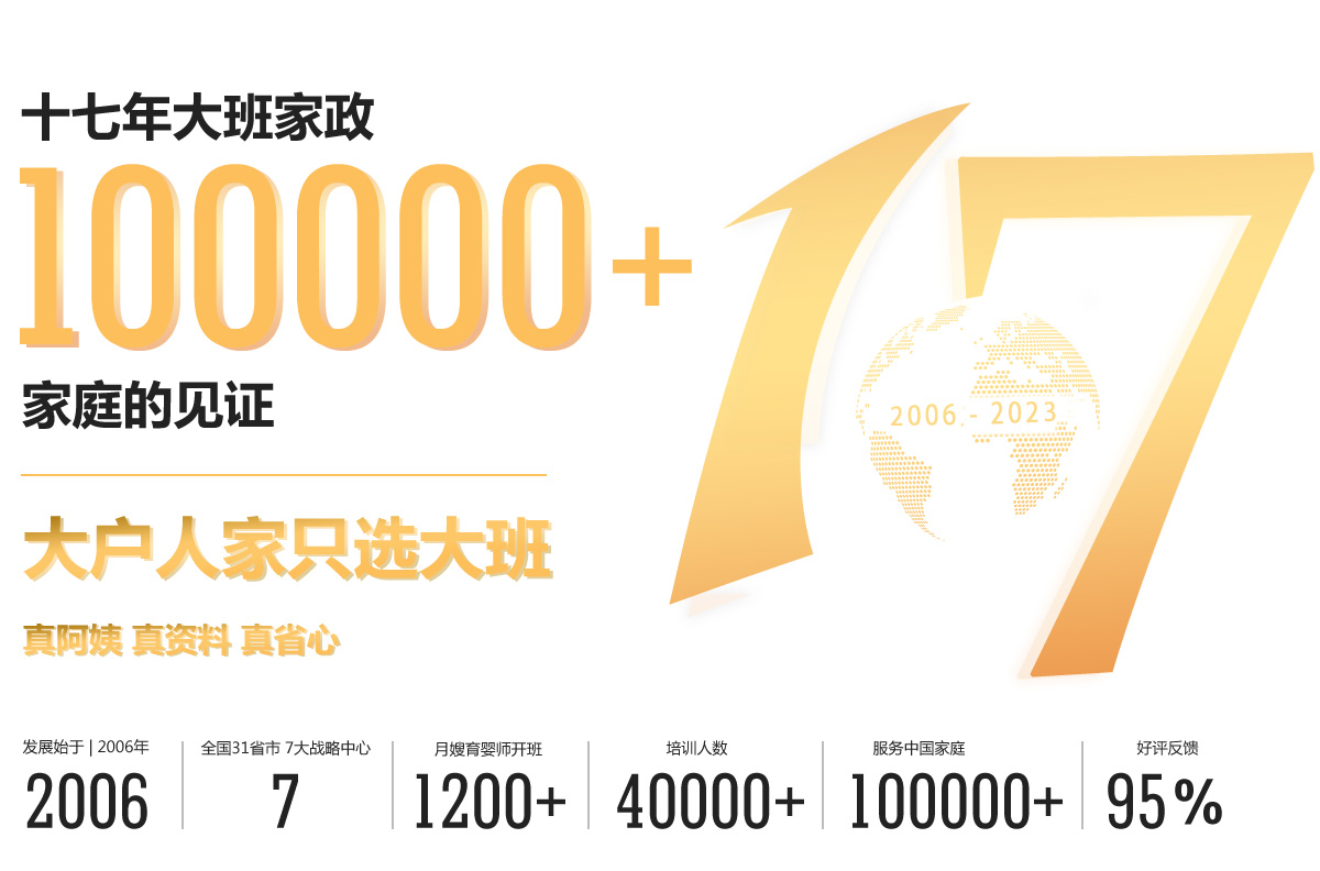 北京大班家政服務(wù)提供高端家政阿姨,育兒嫂,星級(jí)月嫂,養(yǎng)老護(hù)理等高端家政服務(wù),大班家政真阿姨,真資料,真省心,專(zhuān)注家政服務(wù)15年,品質(zhì)服務(wù)有保障,北京高端家政就選北京大班家政服務(wù)。大班家政立足北京面向全國(guó)的高端客戶(hù)提供專(zhuān)業(yè)的母嬰護(hù)理、育嬰育兒、高端保姆、病患護(hù)理、老年照護(hù)等家庭服務(wù)商。我們?cè)跇I(yè)內(nèi)率先提出“真阿姨 真資料 不造假”并在中國(guó)家政服務(wù)業(yè)率先受民政部、商務(wù)部、國(guó)資委、發(fā)改委、人力資源社會(huì)保障部等國(guó)家有關(guān)部門(mén)的業(yè)務(wù)指導(dǎo)和任務(wù)委托。